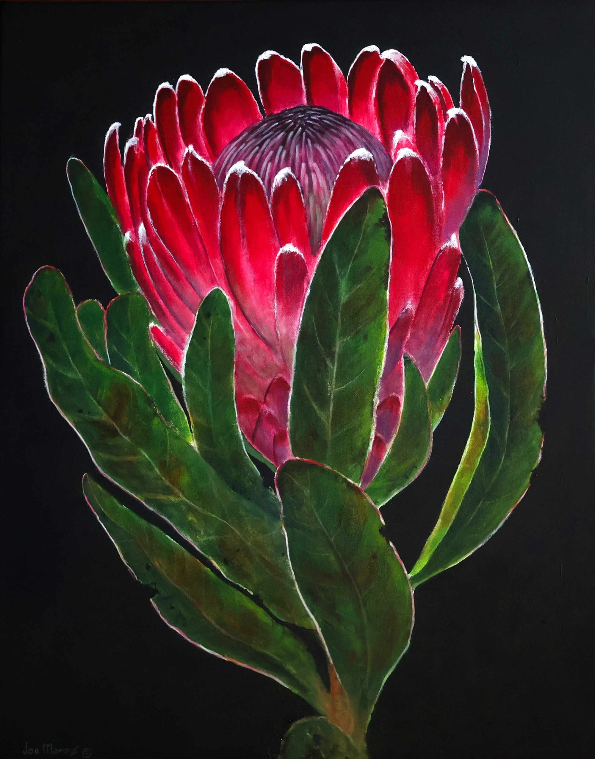 Original Acrylic Painting on Canvas Measurements: 800 x 600mm Block Mounted The Protea is far more than a flower; it is a powerful symbol of South Africa’s natural resilience and diversity. Thriving in some of the harshest conditions on earth, the Protea has evolved to withstand drought, fire, and poor soils, yet it produces blooms of extraordinary strength and beauty. Its bold structure and luminous colours speak of survival through adaptation, making it a fitting national emblem for a country shaped by endurance and renewal. Each Protea flower tells a story of ancient landscapes, wild fynbos plains, and the quiet strength found in nature’s ability to endure and flourish against all odds.